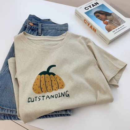 | nameOriginal | Ins Age-reducing Fun Pumpkin Printed Short-sleeved T-shirt Summer Thin Snowflake Cotton Round Neck Loose Simple Pullover Top |