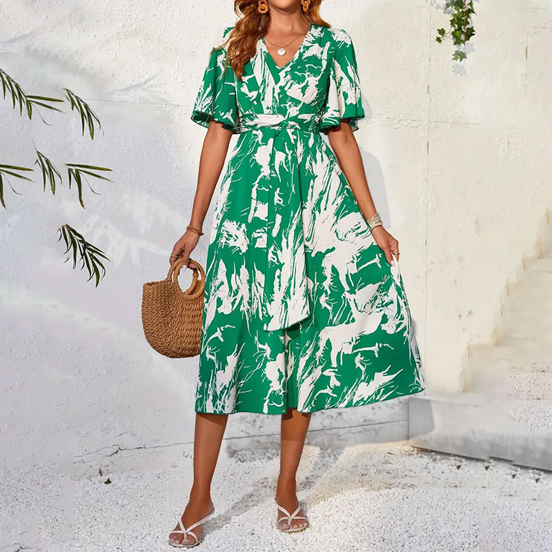 | nameOriginal | ins2024 summer new elegant romantic large dress bell sleeve V-neck lotus leaf ribbon printed dress long dress |