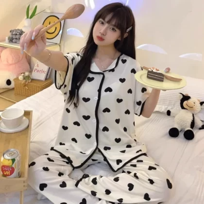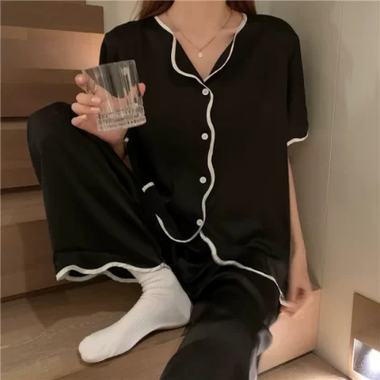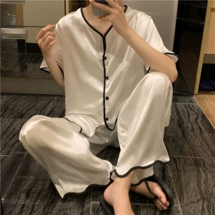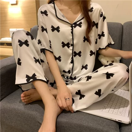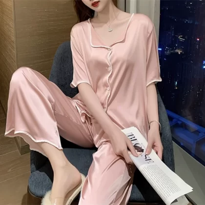 Internet celebrity ice silk women's short-sleeved cardigan and trousers cool pajamas