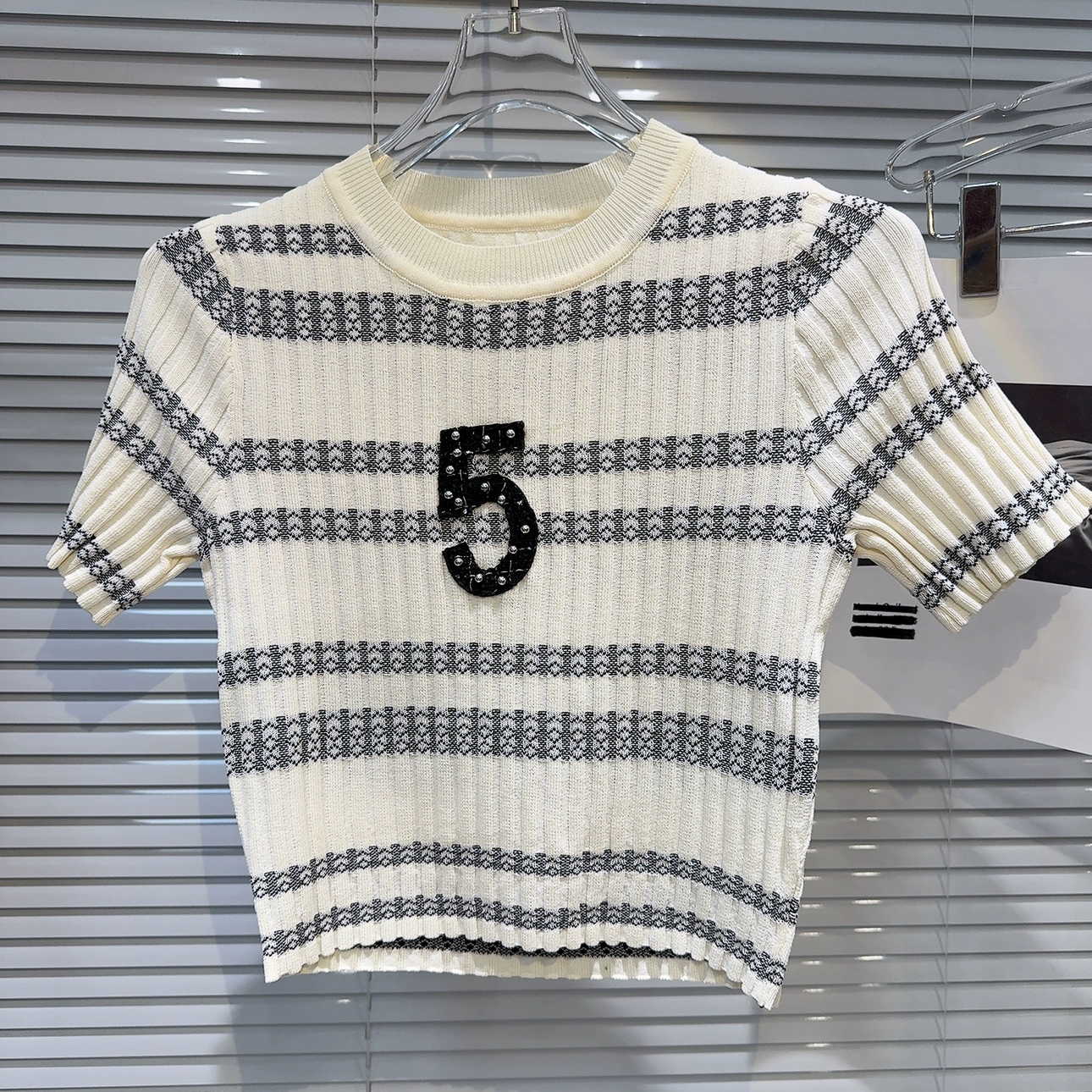 Internet celebrity Xiaoxiang style digital striped T-shirt embroidery