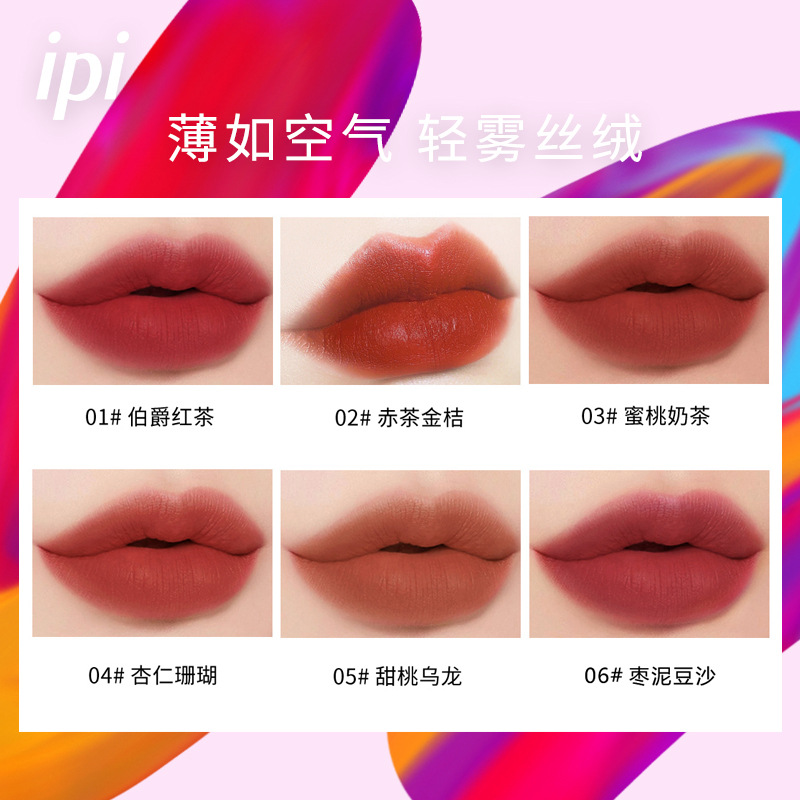 | nameOriginal | ipi air mist lip glaze velvet matte milk tea bean paste matte lipstick lasting white female student cheap |