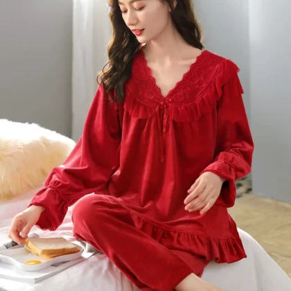 Island velvet pajamas for women autumn and winter red zodiac year plus velvet home clothes spring and autumn thickened high-end coral velvet suit