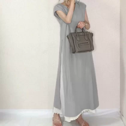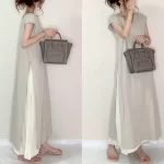 | nameOriginal | Japanese summer solid color simple loose large size two-piece set pleated stitching large hem short-sleeved dress long skirt for women |