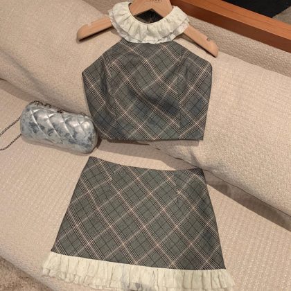 [Japanese Sweetheart] Plaid Lotus Lace Sweet Sleeveless Versatile Top + A-Line Skirt for Women