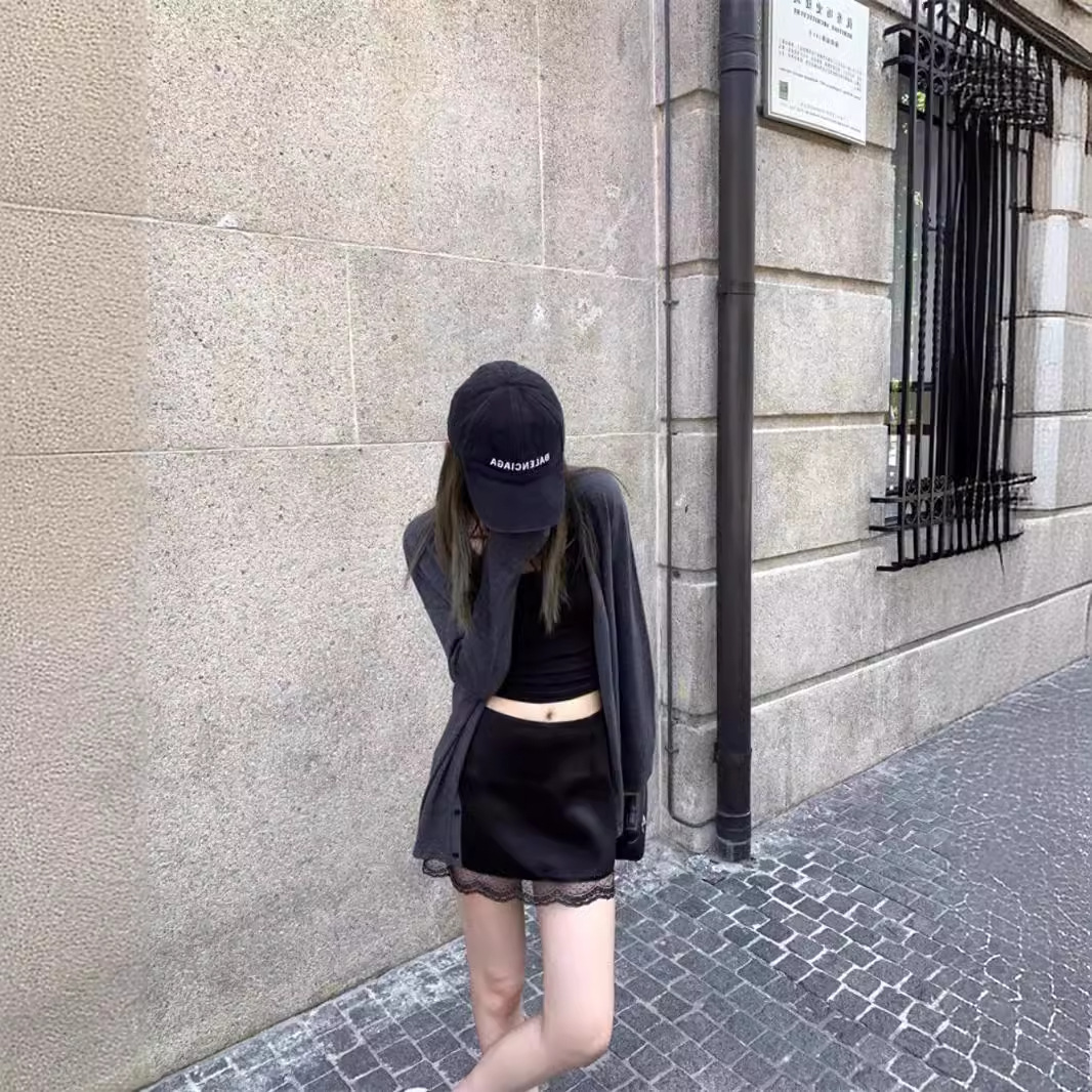Jiao Qiao Xiao Guo Jing ~ lace stitching satin overskirt solid color skirt women's pants 2 colors