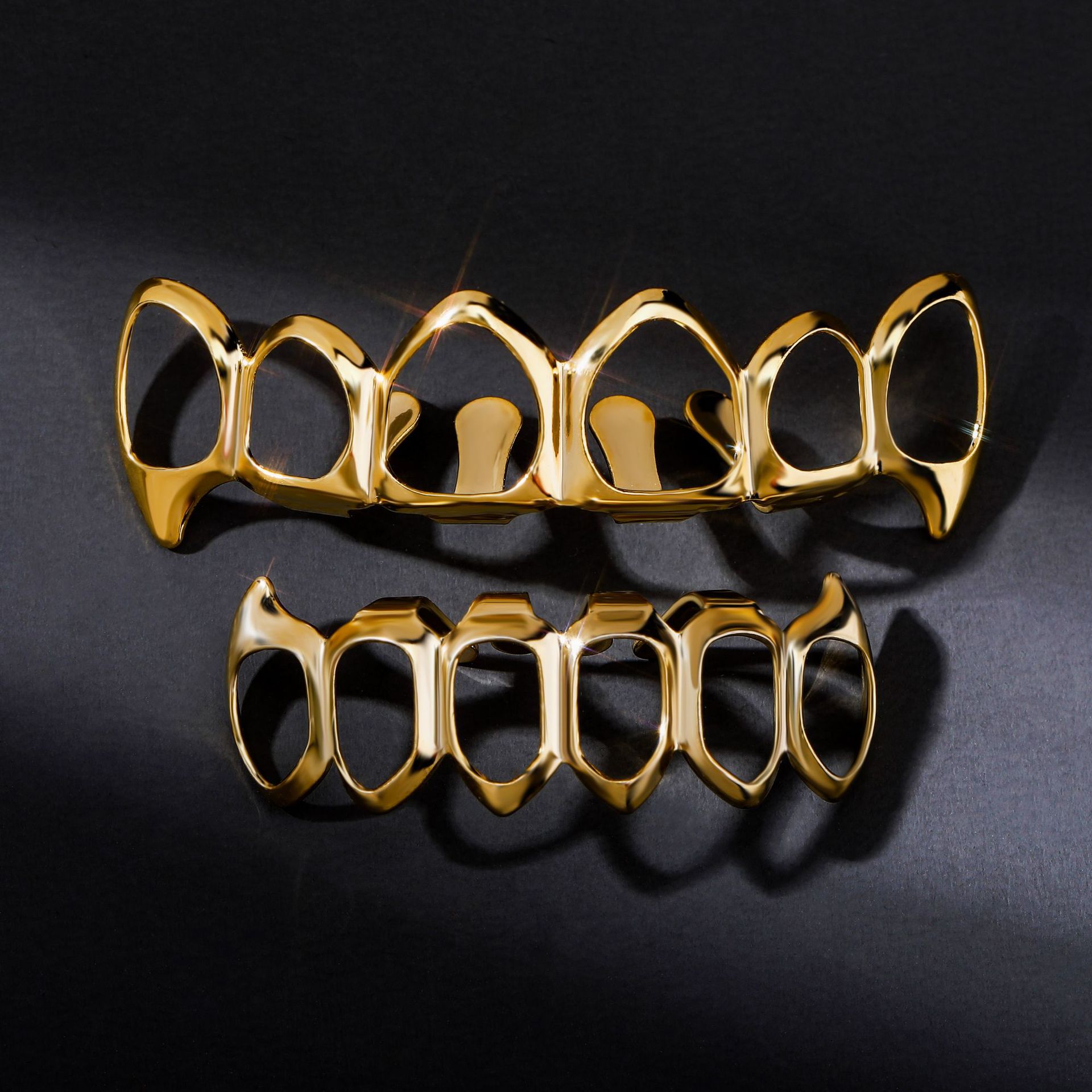 مجوهرات Jinao الأوروبية والأمريكية مدببة مجوفة الأقواس الهيب هوب محب كبير الذهب الأسنان الذهب الحقيقي الكهربائي الأسنان Grillz
