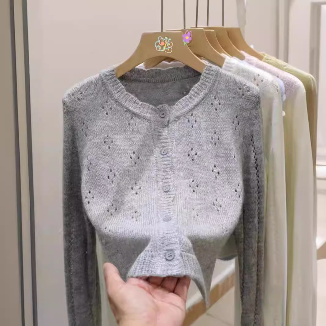 Knitted cardigan 2024 round neck hollow female Korean version of Joker knitted cardigan thin jacket small coat female-MY