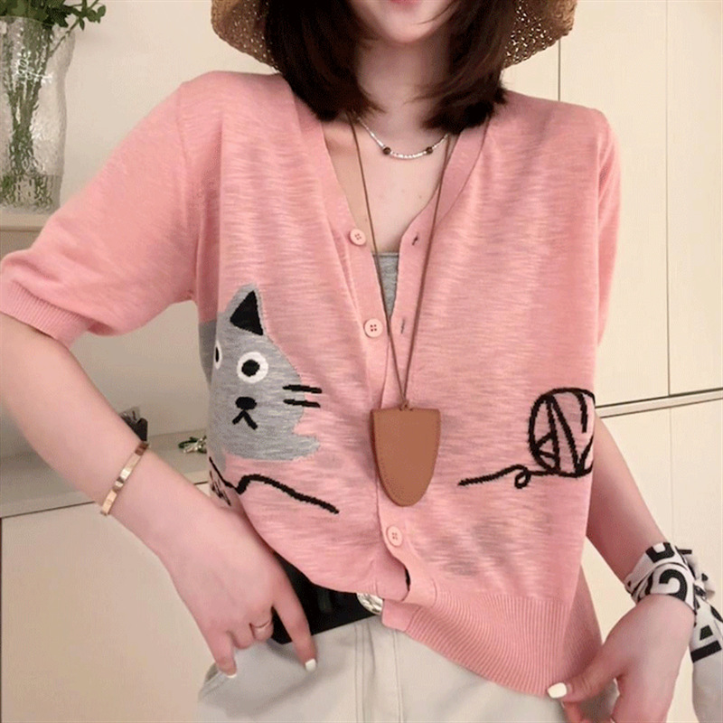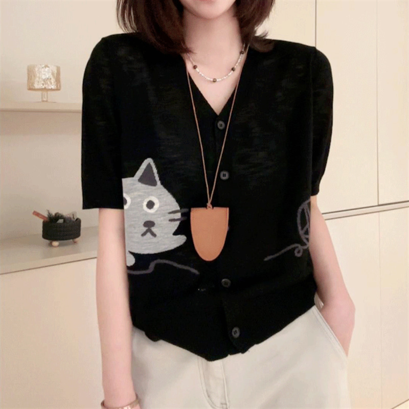 Knitted Cardigan Thin Women's Ice Silk Knitted 2024 Women's Summer New V-neck Printed Knitted Short-sleeved Women's Top