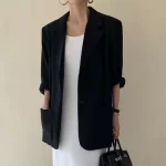 سترة كورية أنيقة صيفية فرنسية راقية بياقة واحدة وفضفاضة ومتعددة الاستخدامات ذات لون سادة وأكمام طويلة للنساء