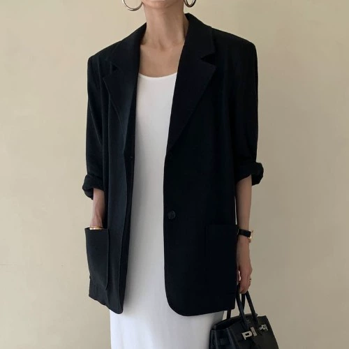 Korean chic summer French high-end suit collar single-breasted loose and versatile thin solid color long-sleeved jacket for women