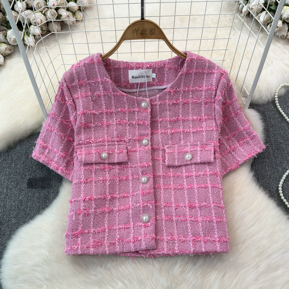 | nameOriginal | Korean chic summer retro small style round neck pearl button design loose short tweed jacket for women |