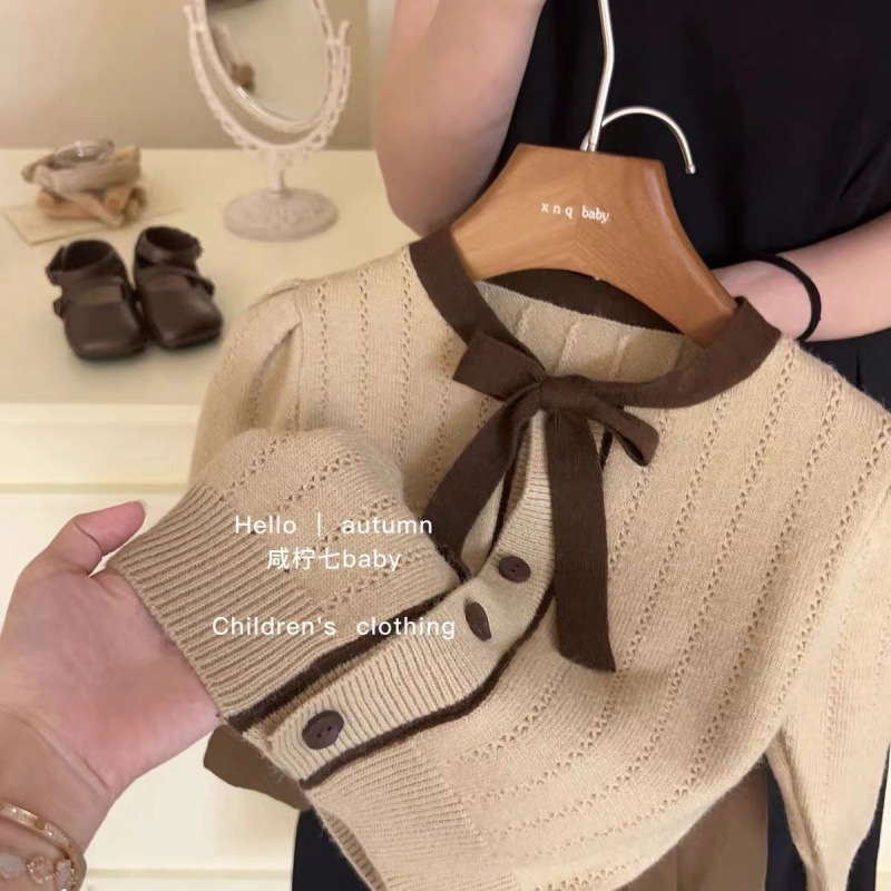 | nameOriginal | Korean children's clothing 2024 autumn girls foreign style brown hollow knit cardigan female baby bow lace sweater |