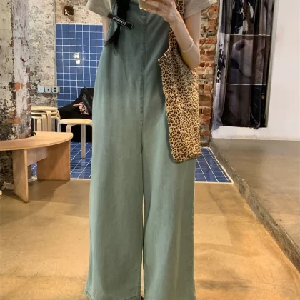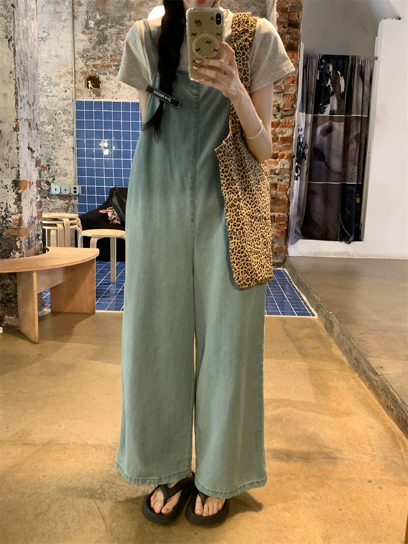 Korean style casual washed thin denim denim trousers with suspenders for women summer 2024 new style foreign style high waist wide leg jumpsuit
