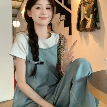 بنطال دينم رفيع غير رسمي على الطراز الكوري مع حمالات للنساء لصيف 2024 بذلة بنمط أجنبي عالية الخصر وواسعة الساق