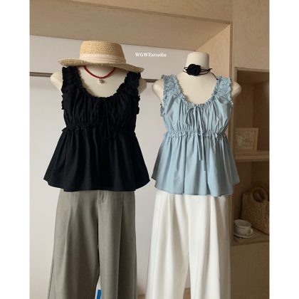 Korean style gathered round neck tank top sleeveless shirt