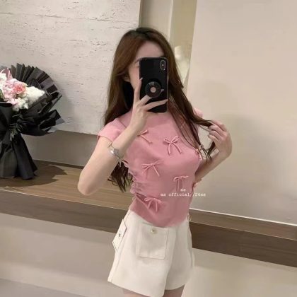 | nameOriginal | Korean Style Gentle Elegant Three-Dimensional Bow Half-High Collar Flying Sleeve Knitted Shirt Women's Summer All-Match Slim Short Sleeve T-Shirt |