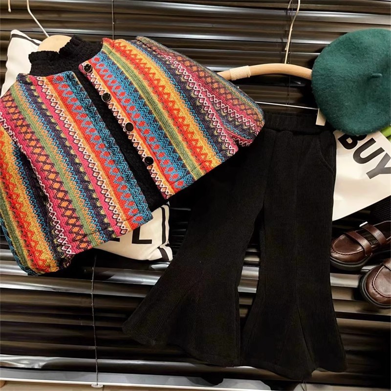 | nameOriginal | Korean style girl's ethnic retro style colorful striped two-piece autumn Chanel style jacket flared pants suit |
