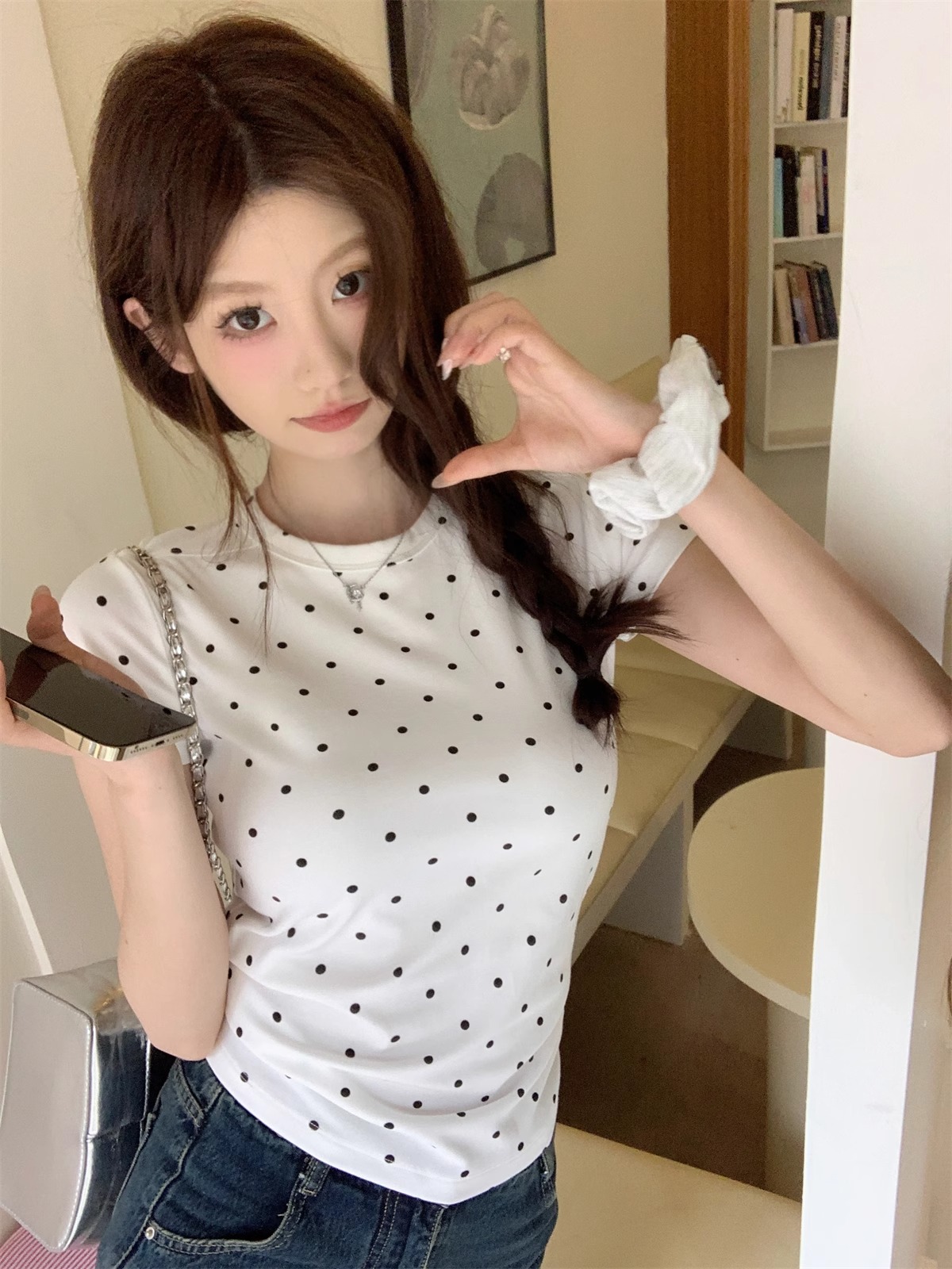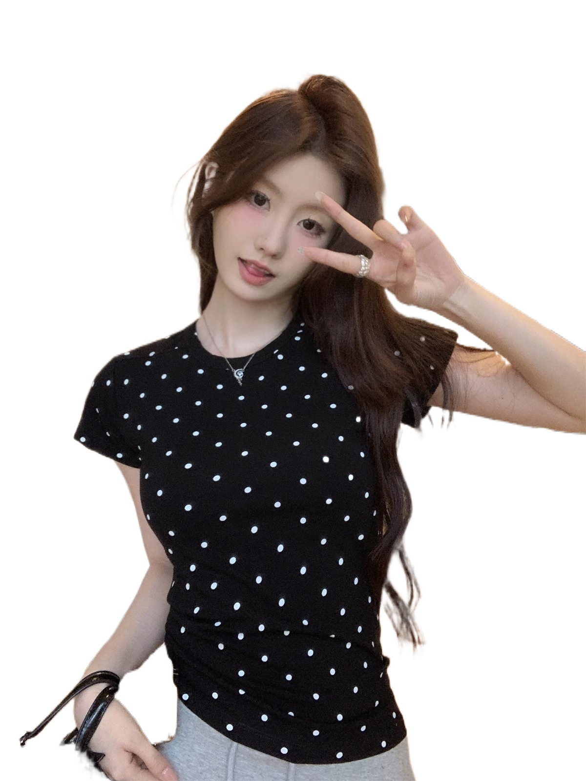 | nameOriginal | Korean Style Grey Wave Dot Positive Shoulder Short-sleeved T-shirt Women's Summer 2024 Hot Girls Slim-fit Slimming Short Top Hair |