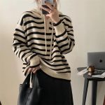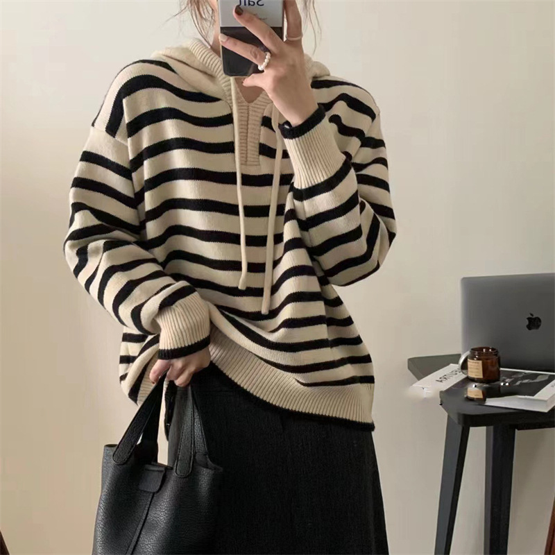 | nameOriginal | Korean style hooded striped pullover sweater for women 2023 autumn and winter New style lazy style loose slimming outerwear sweater fashion |