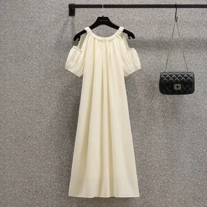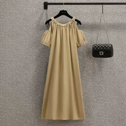 | nameOriginal | Korean style loose off-shoulder temperament dress summer plus size women's clothing for fat girls covering belly French sweet mid-length skirt |