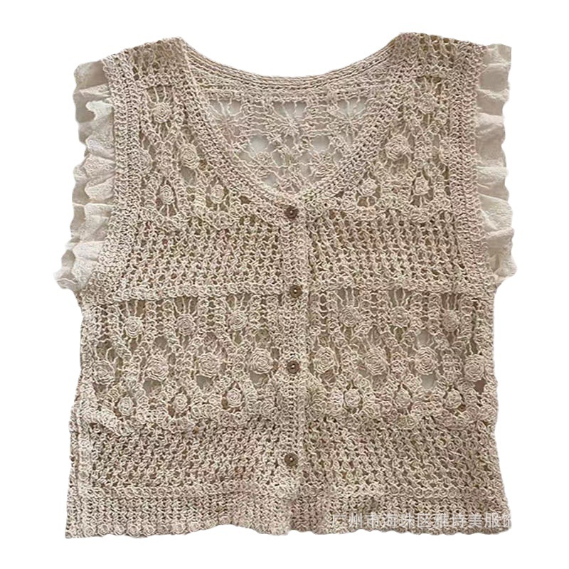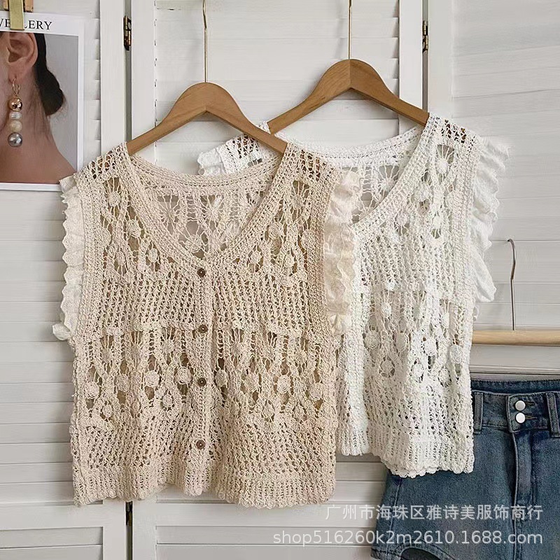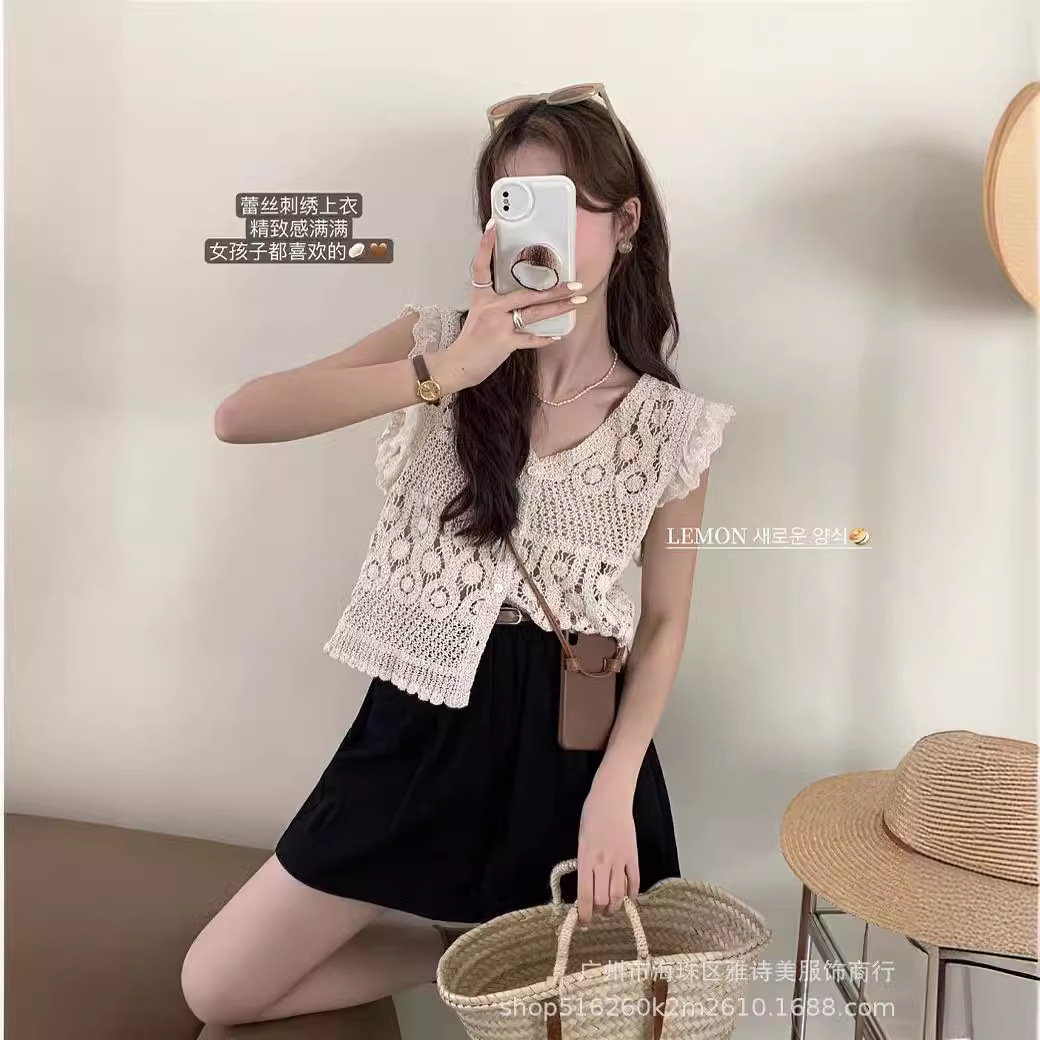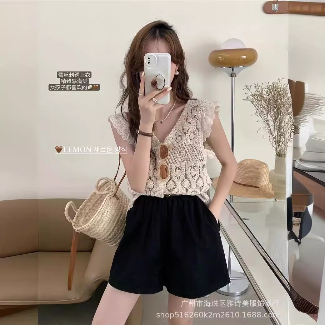 | nameOriginal | Korean style niche temperament V-neck hollow vest women's summer sweet flying sleeve all-match loose short top |