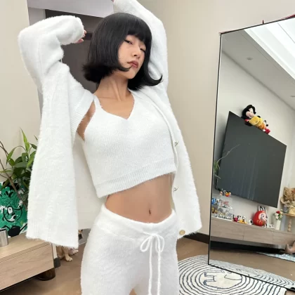 | nameOriginal | Korean style pearl white mohair knitted pajamas for women winter new style plus velvet and thickened warm home clothes three-piece set |