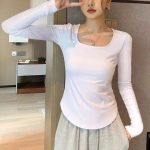 Korean Style Pure Desire Style Square Collar Curved Hem Slim-fit Long Sleeve White Base Shirt T-shirt Women's All-match Elegant Fashionable Top