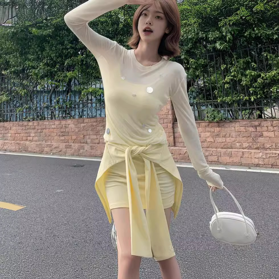 الكورية نمط حزام وهمية قطعتين التوابل فتاة كل مباراة U الرقبة أكمام تنورة حزام المرأة الصيف تصميم الأزياء الشعور لفستان
