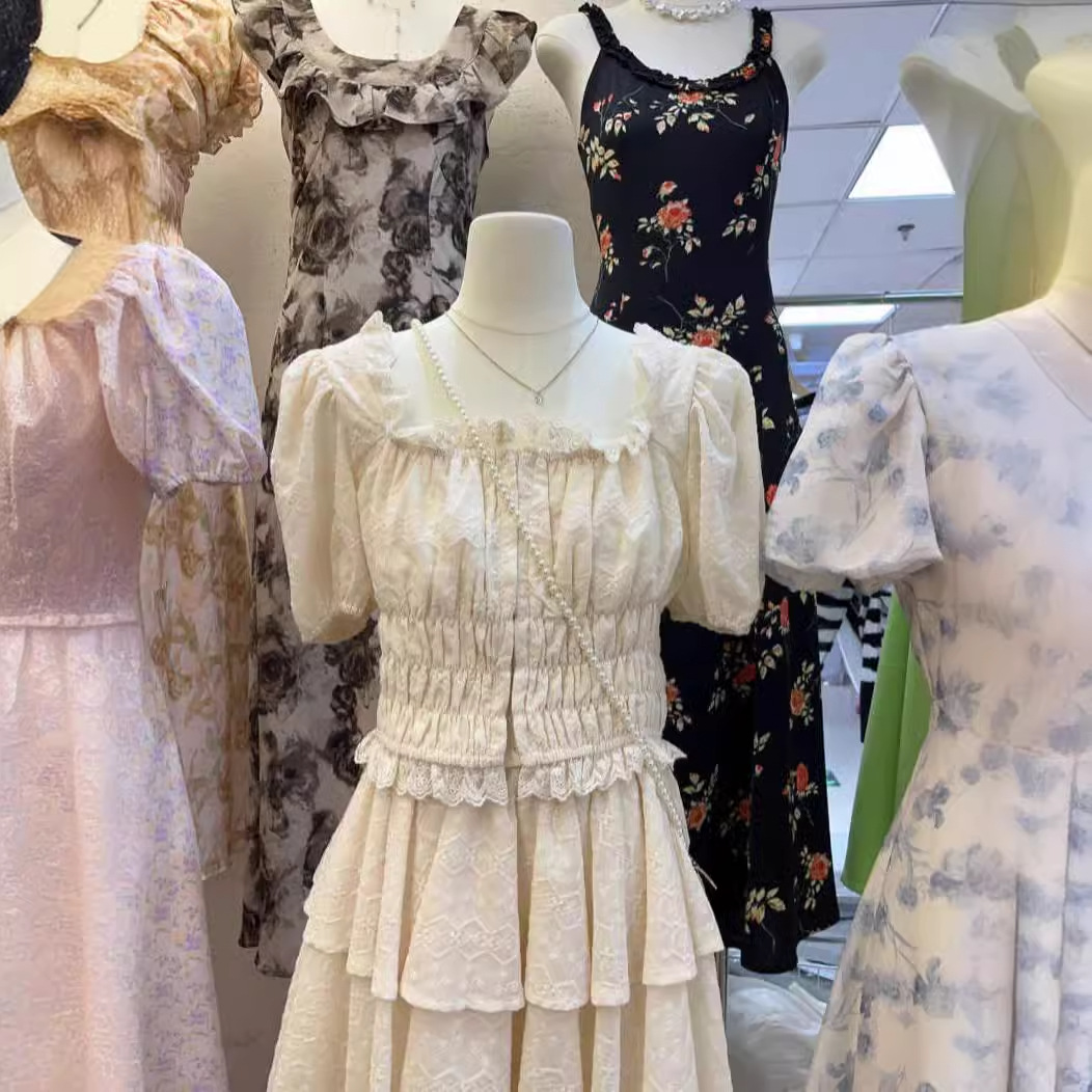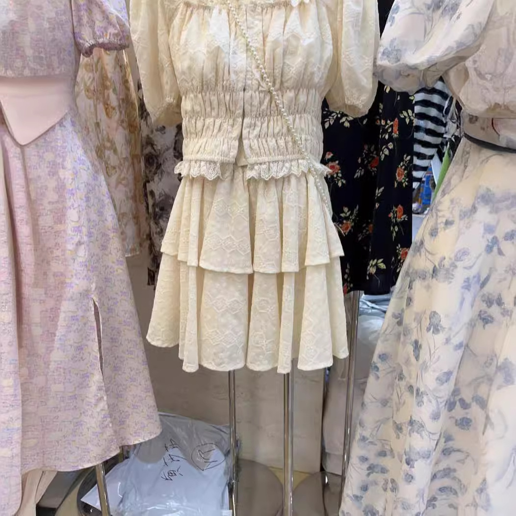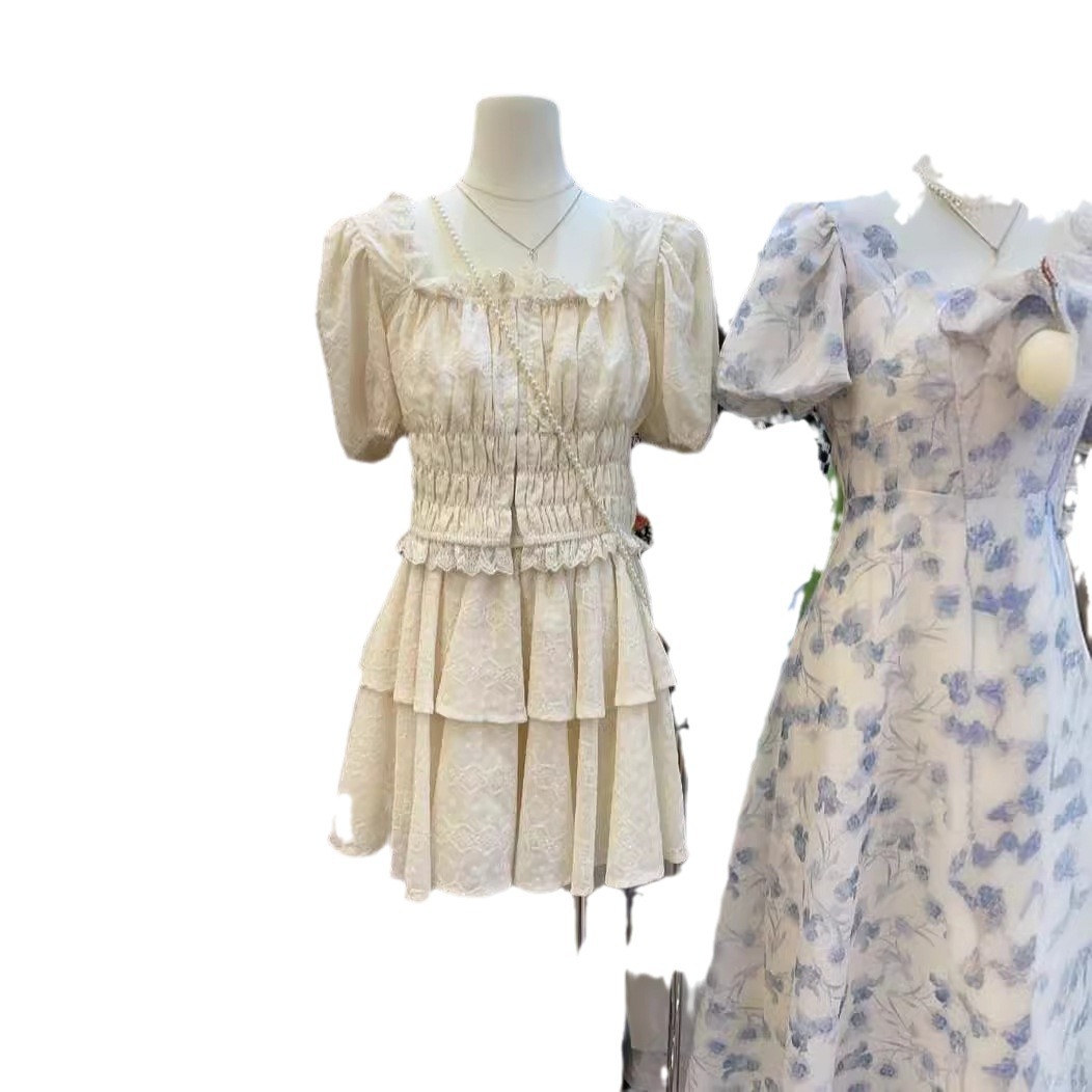 Korean-style Thirteen Lines 2024 Summer New Short-sleeved Square Collar Top Half Skirt Two-piece Suit Women