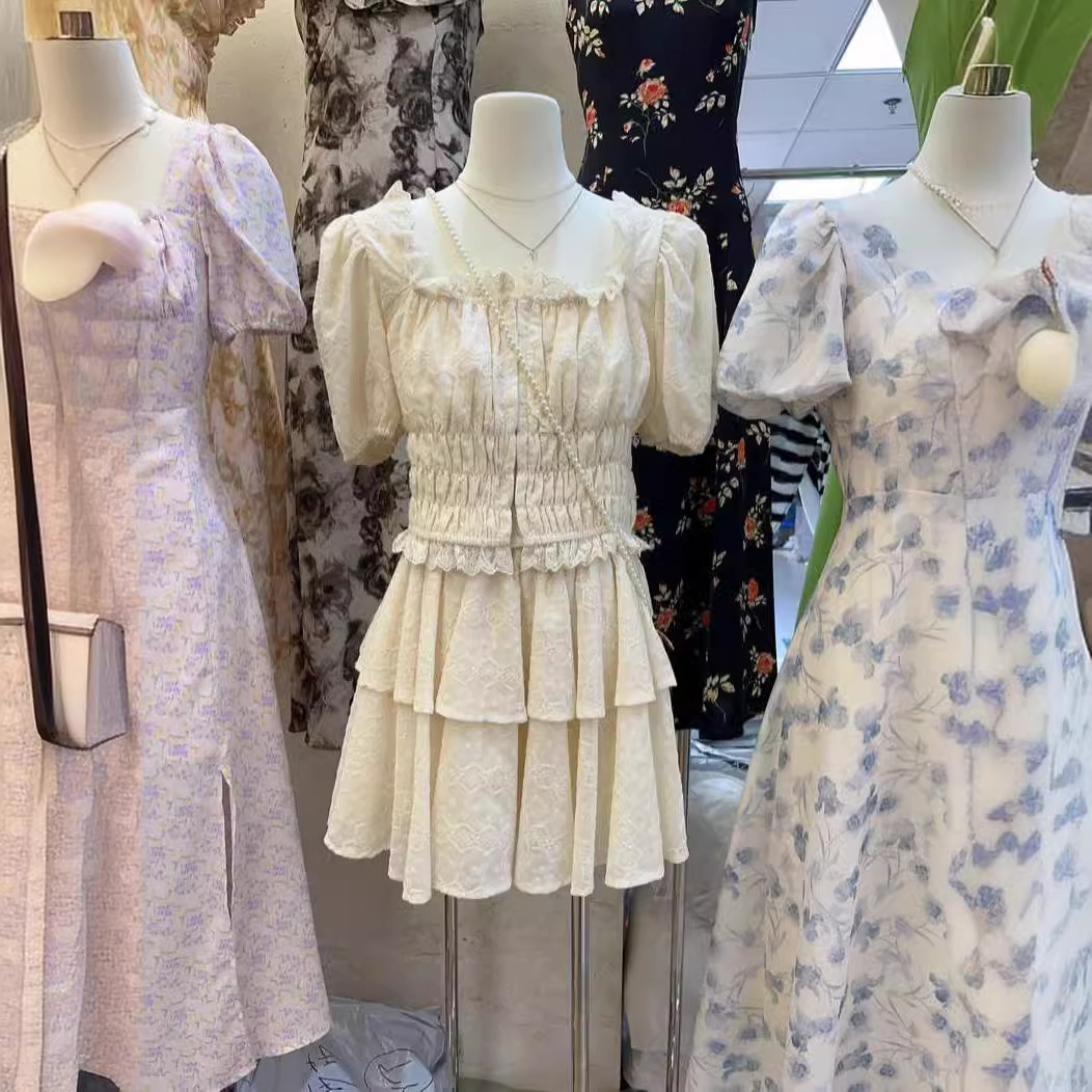 الكورية نمط ثلاثة عشر خطوط 2024 صيف جديد قصيرة الأكمام ساحة طوق أعلى نصف تنورة قطعتين دعوى النساء