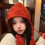 النسخة الكورية ins قبعة صوفية حمراء للنساء في الخريف والشتاء محبوك يدويا شرابة قبعة صوفية شتاء دافئ الأذن حماية قبعة