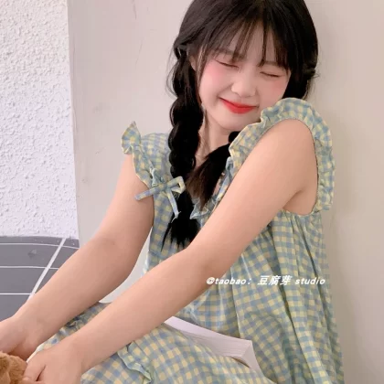 Korean version of ins plaid sleeveless vest nightgown for women summer girl long pajamas internet celebrity sweet thin home clothes