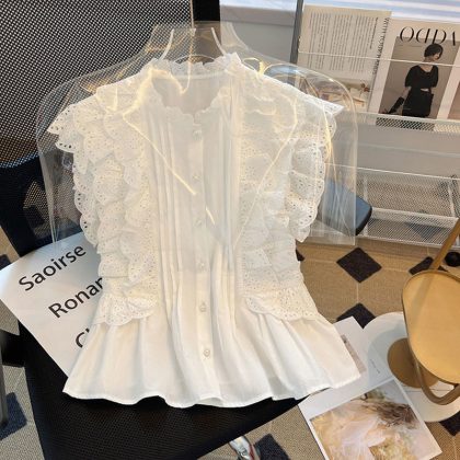 Lace Shirt Summer Beautiful Beautiful White Shirt Women's Age-reducing Flying Sleeve Niche Design Sense Tight Waist Elegant Short Top