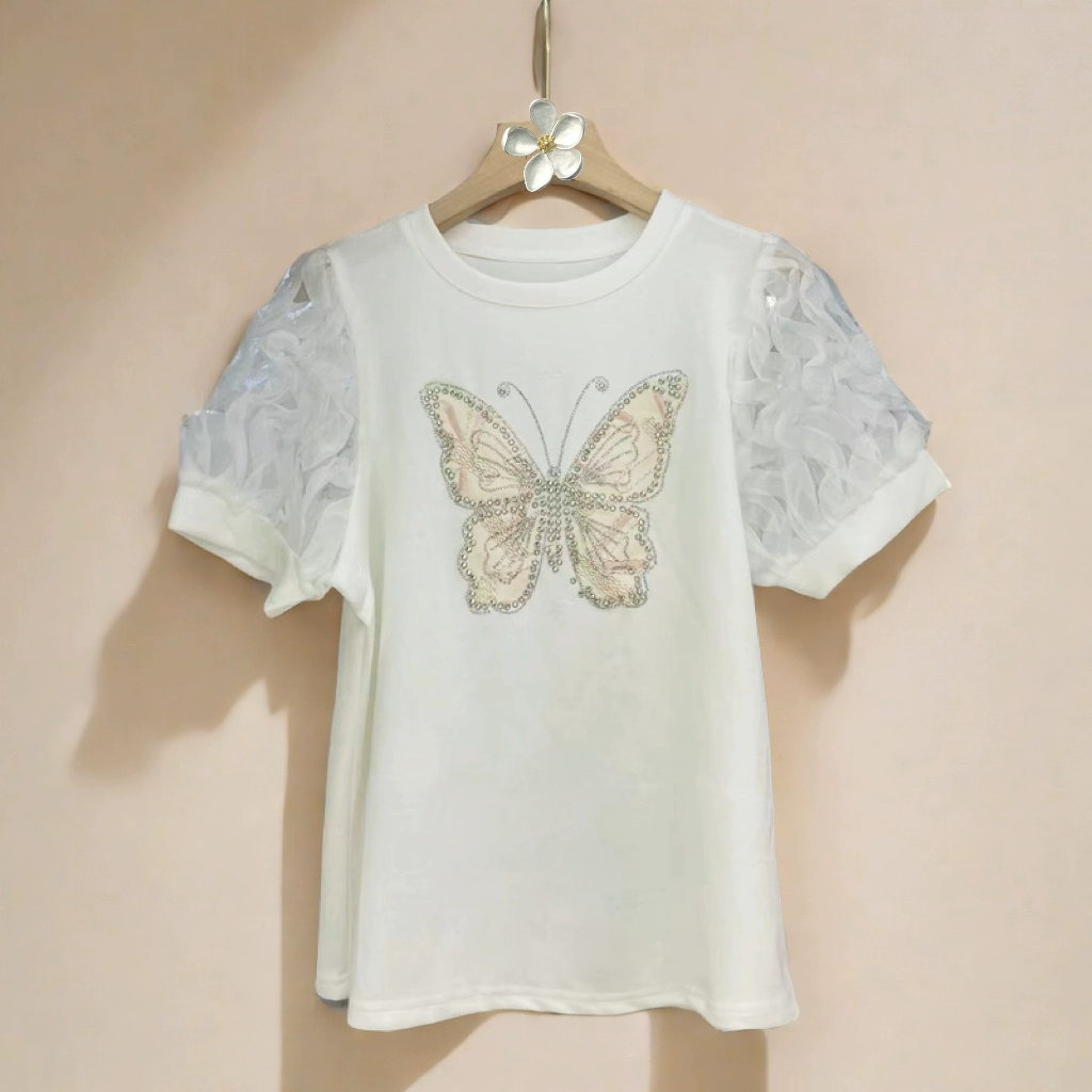 | nameOriginal | Lace splicing top women's summer 2024 heavy industry butterfly decoration round neck age-reducing T-shirt sweet casual and versatile |