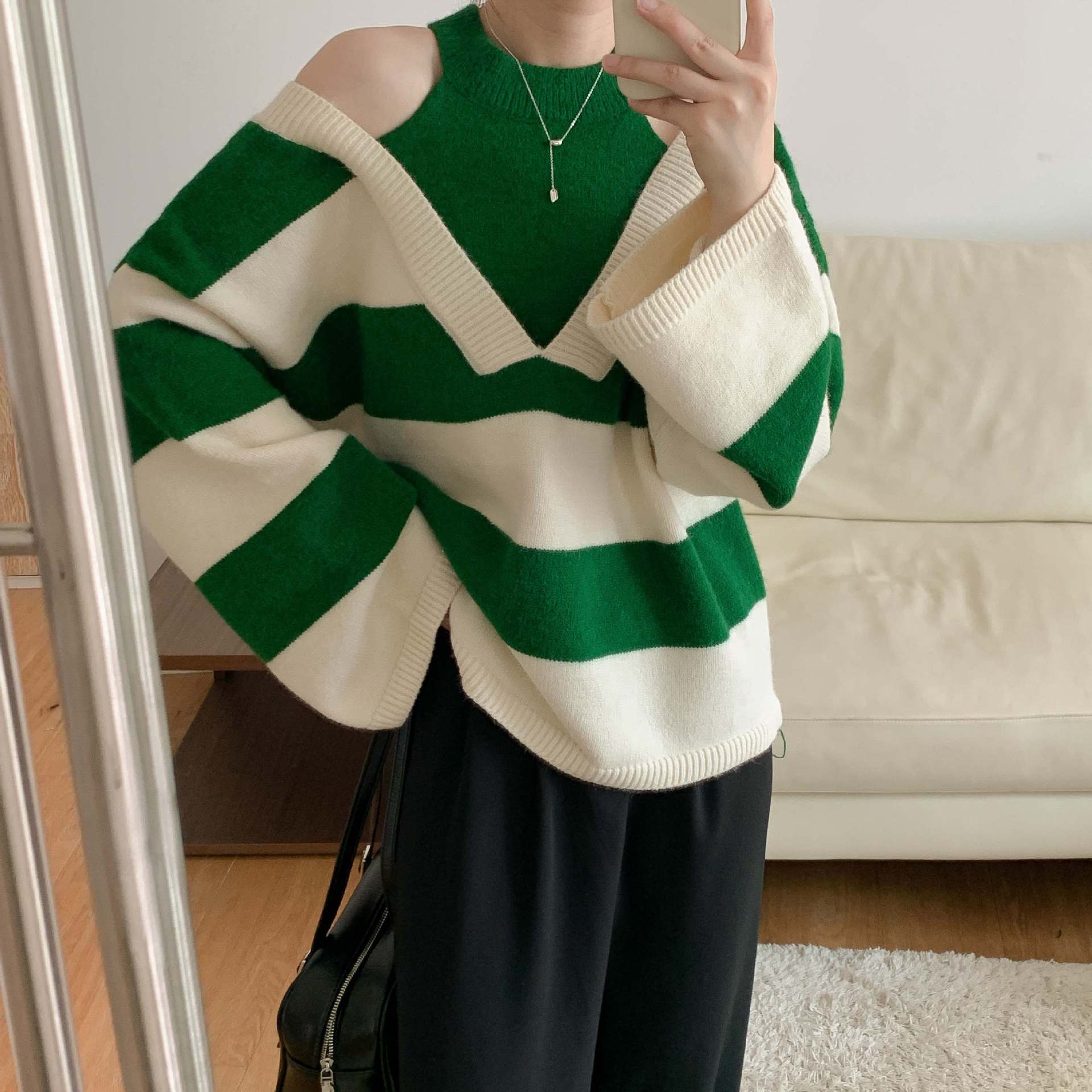 Ladies lazy wind sweater women's 2022 autumn and winter New contrast color design leakage shoulder slimming pullover sweater wholesale