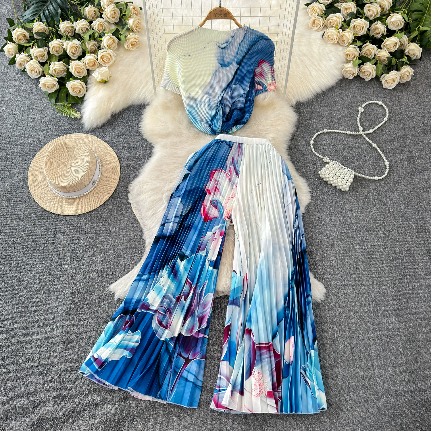 Lady style heavy industry pleated printed loose short-sleeved T-shirt