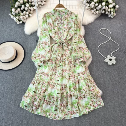 | nameOriginal | Lantern long-sleeved stand-collar A-line elegant dress with wide hem |
