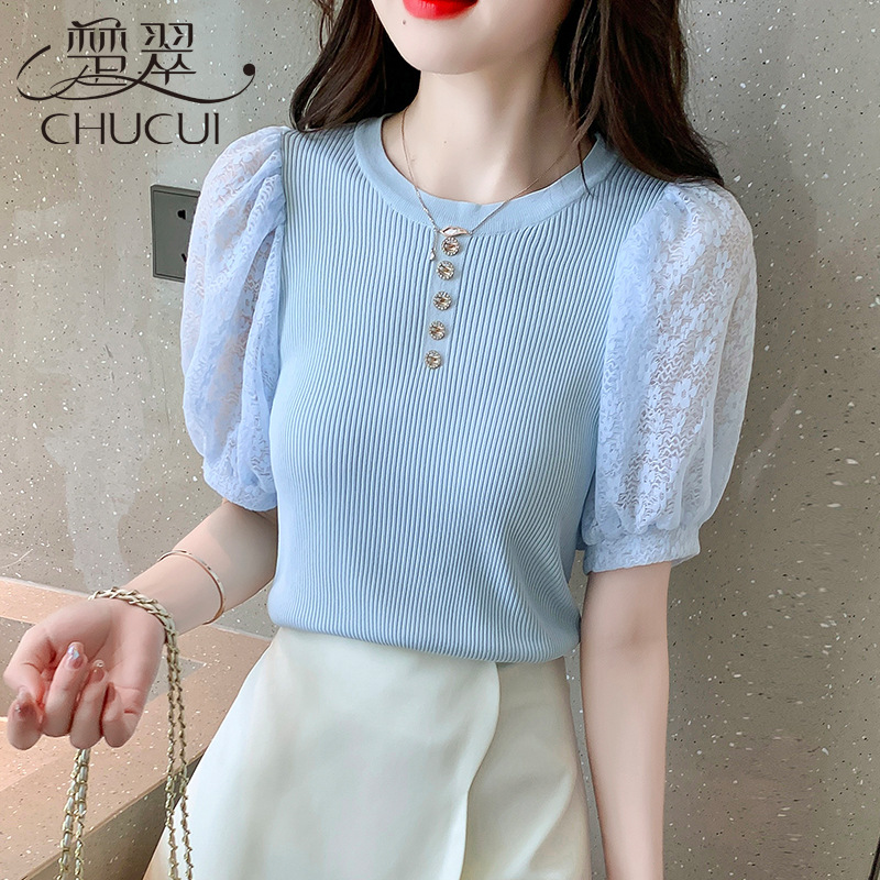 | nameOriginal | Lantern sleeve lace top stitching short sleeve sweater women's T-shirt 2024 new summer chic beautiful shirt |