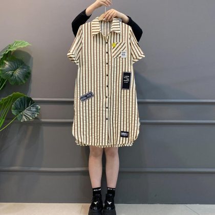 Lapel Letter Edge Short Sleeve Striped Shirt Dress plus size 2024 Summer Korean Style dress Black and White Stripes Other