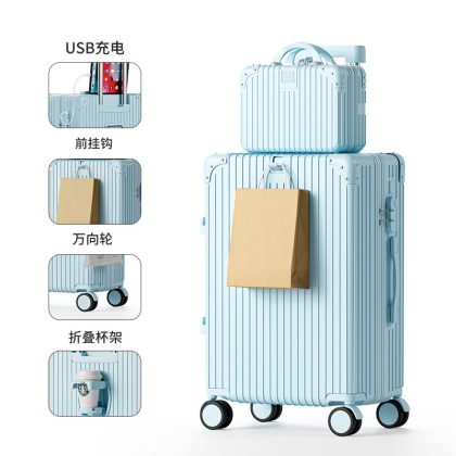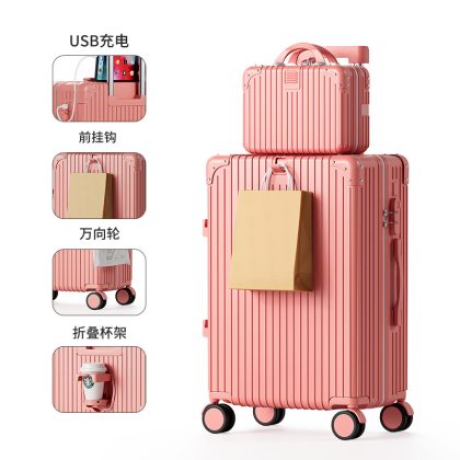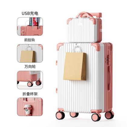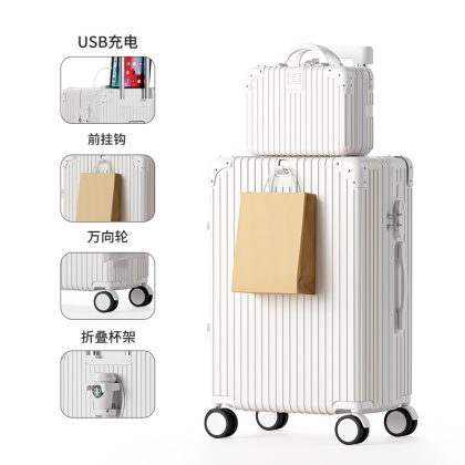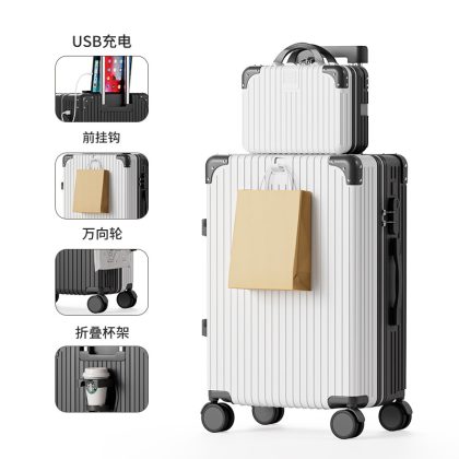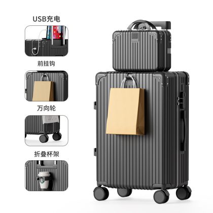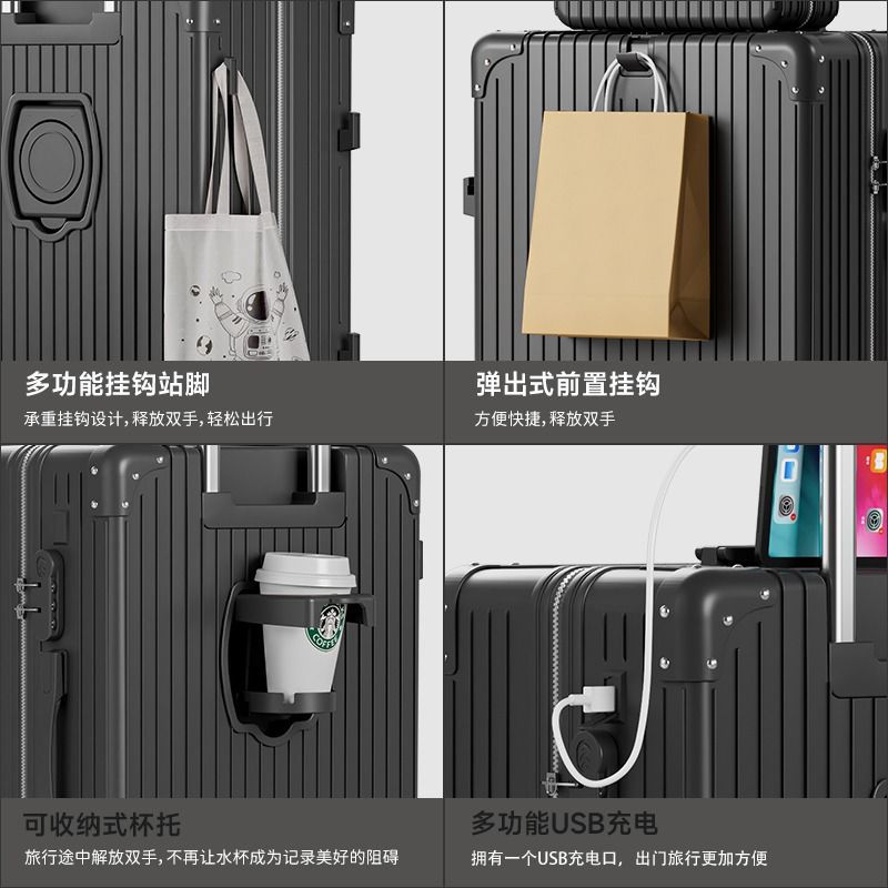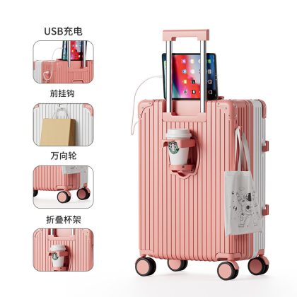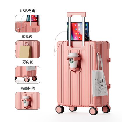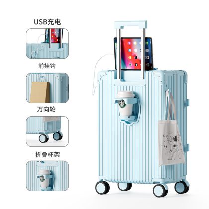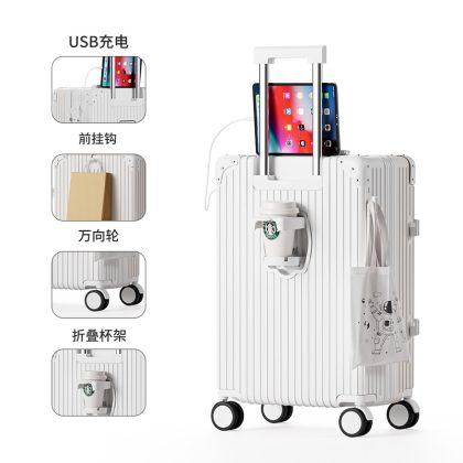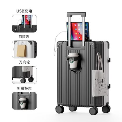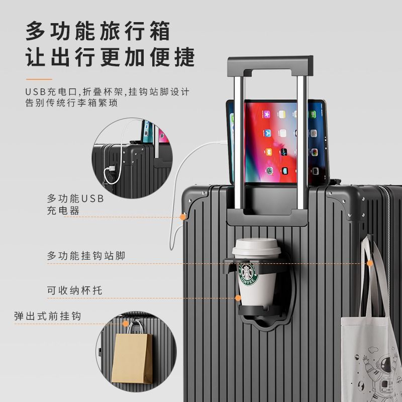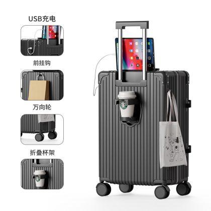 Large-capacity high-value multi-function trolley case adjustable lever folding cup holder USB charging luggage case for men