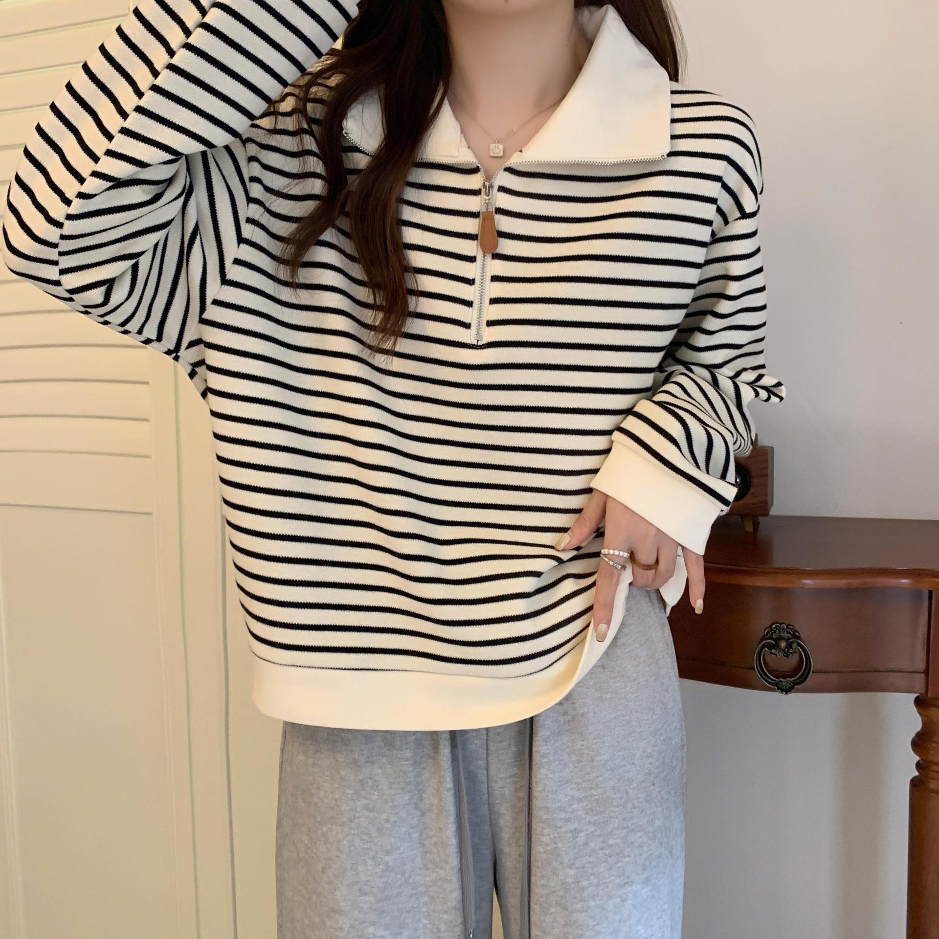 | nameOriginal | Large Size Chubby Girls American Stripe Polo Collar Front Shoulder Sweat Women's Spring New Loose Half Zip Long Sleeve Top |