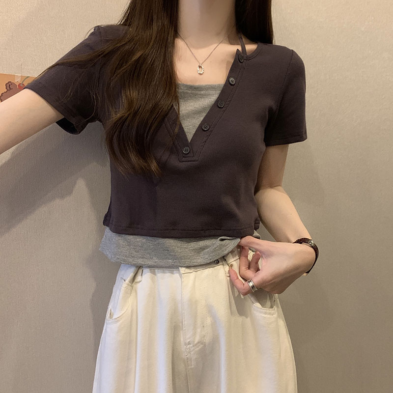 Large size halterneck t-shirt, short-sleeved top, fake two-piece hidden meat