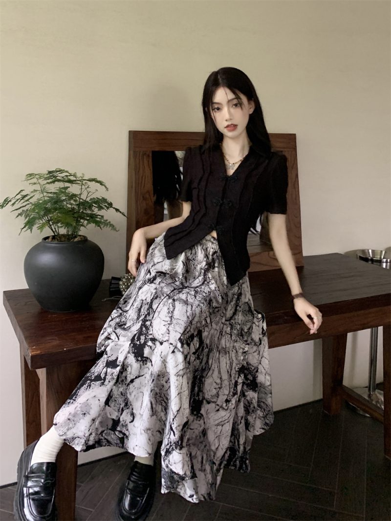 nameOriginal | Large size new Chinese style suit short-sleeved shirt for women summer fat MM ink skirt design two-piece set |