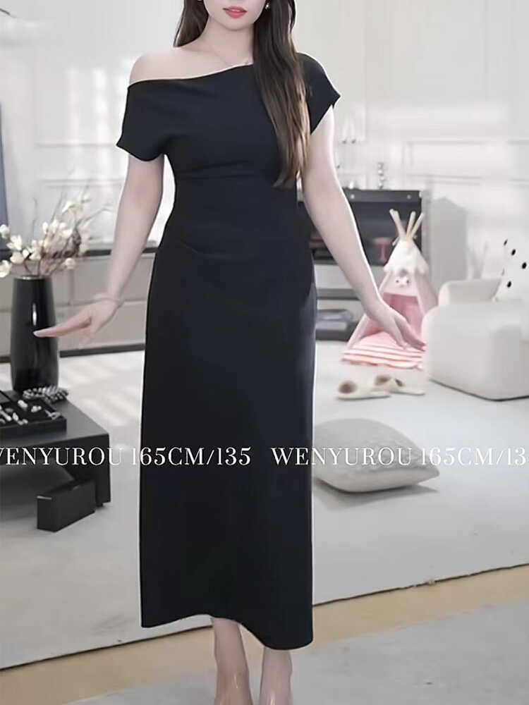 Large size one-shoulder dress for women 2024 summer new design slimming and flesh-covering sexy off-shoulder skirt