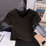 | nameOriginal | Large size right shoulder short sleeve v-neck summer pure cotton thread sexy slim hem pleated irregular solid color top |