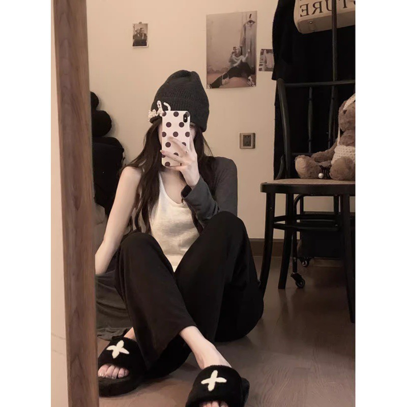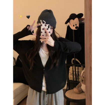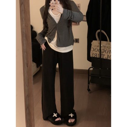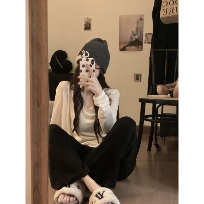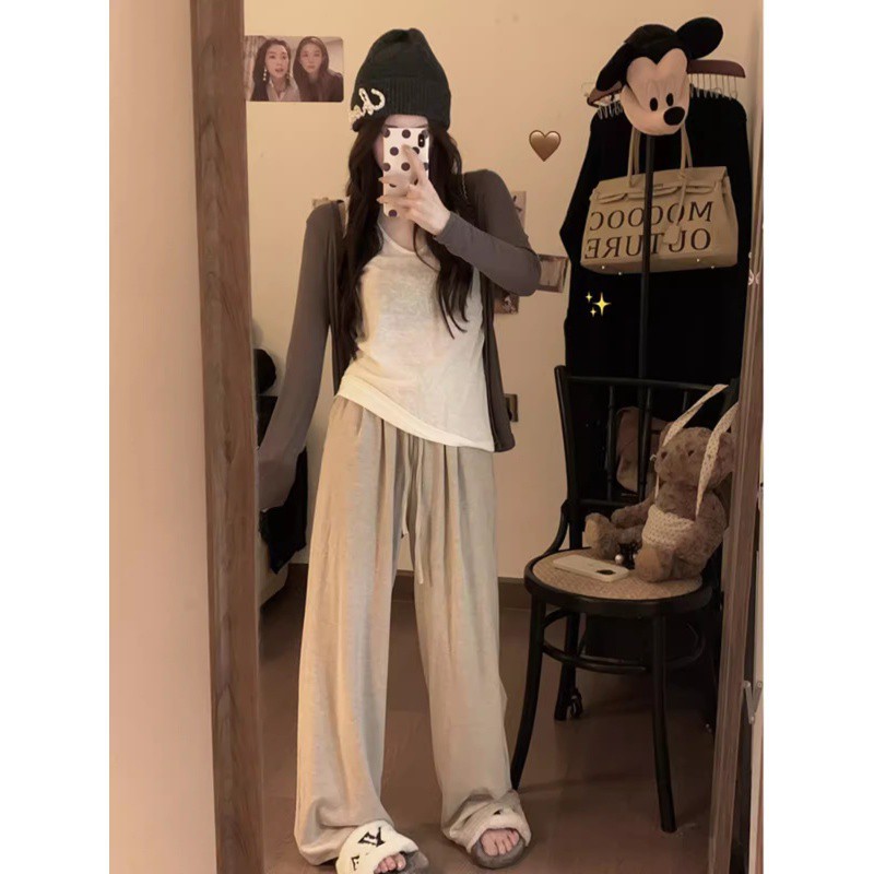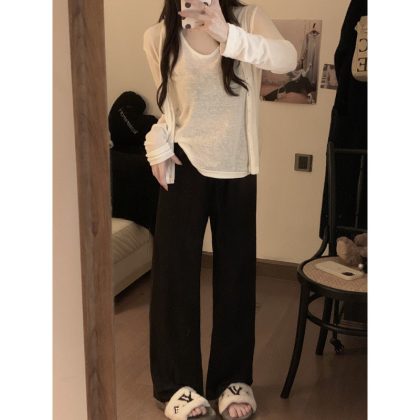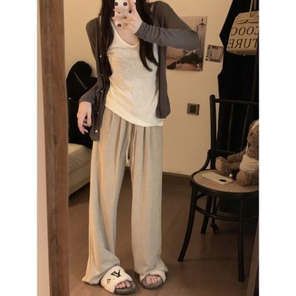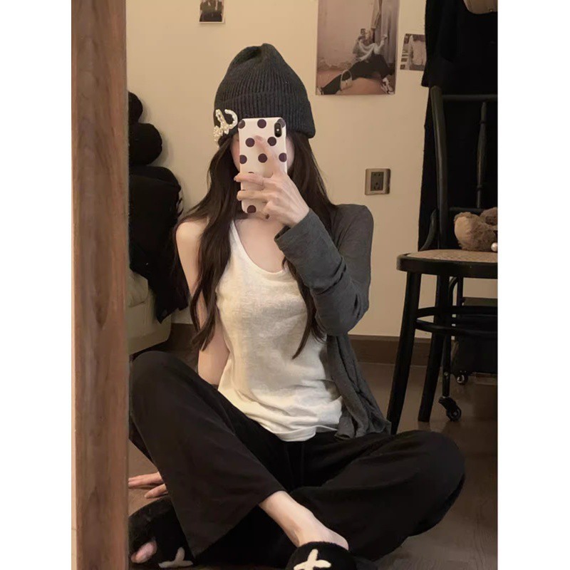 Lazy Style Set Women's Spring Loose Sunscreen Knitted Cardigan White Inner Vest Casual Wide-leg Pants Three-piece Set