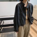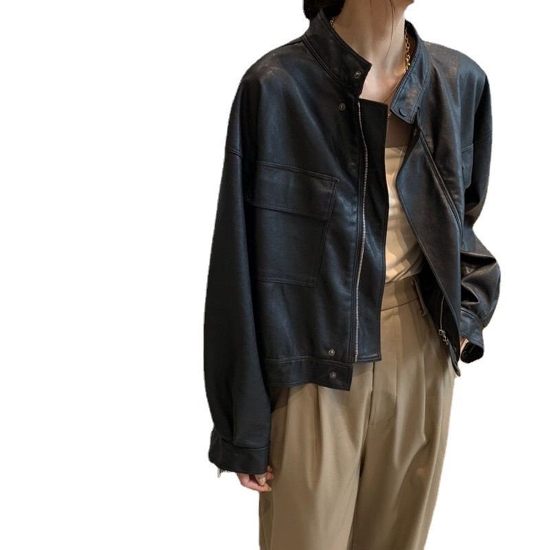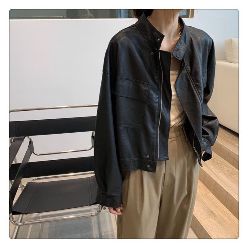 Leather women's spring and autumn Korean version of stand collar handsome wallet pocket locomotive good quality short coat net red a wholesale