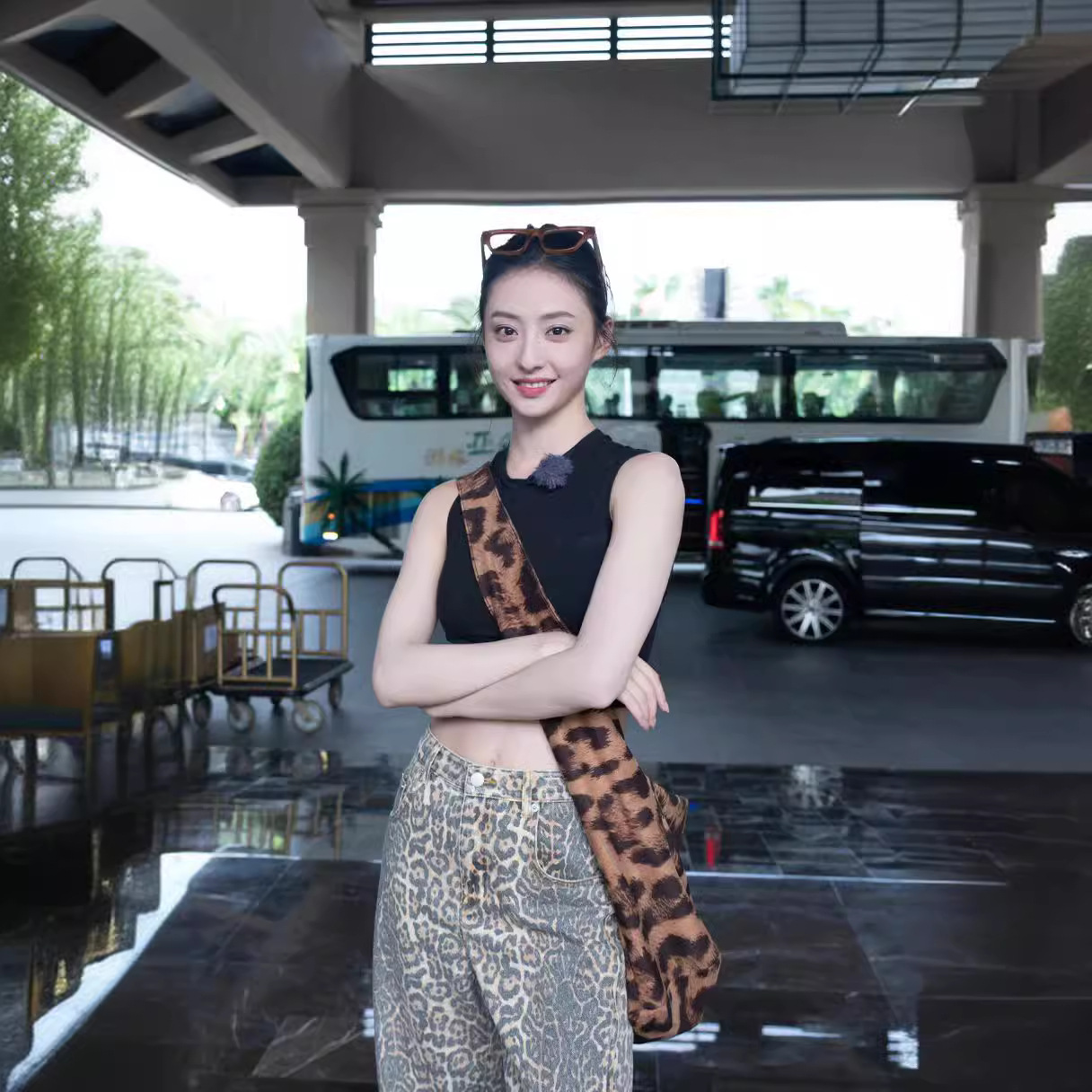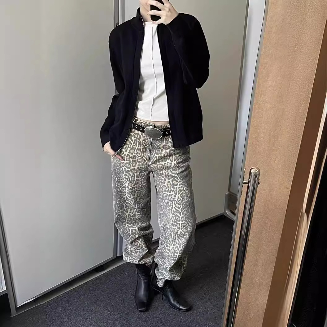 بنطال جينز واسع الساق مغسول بطبعات جلد الفهد