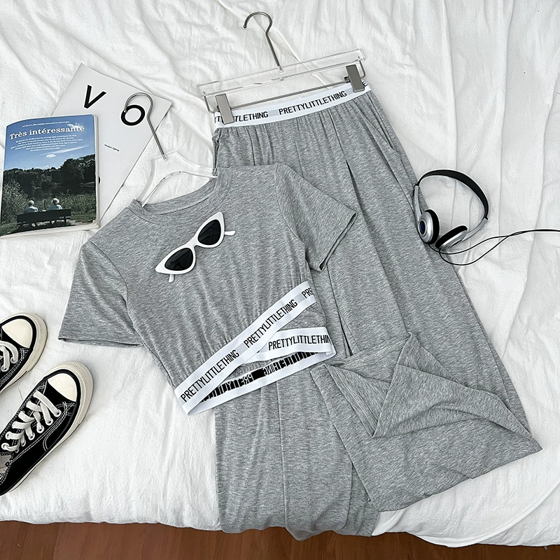 | nameOriginal | Letter printed irregular short T-shirt top + high waisted slimming wide leg pants casual pants two-piece set for women in summer |