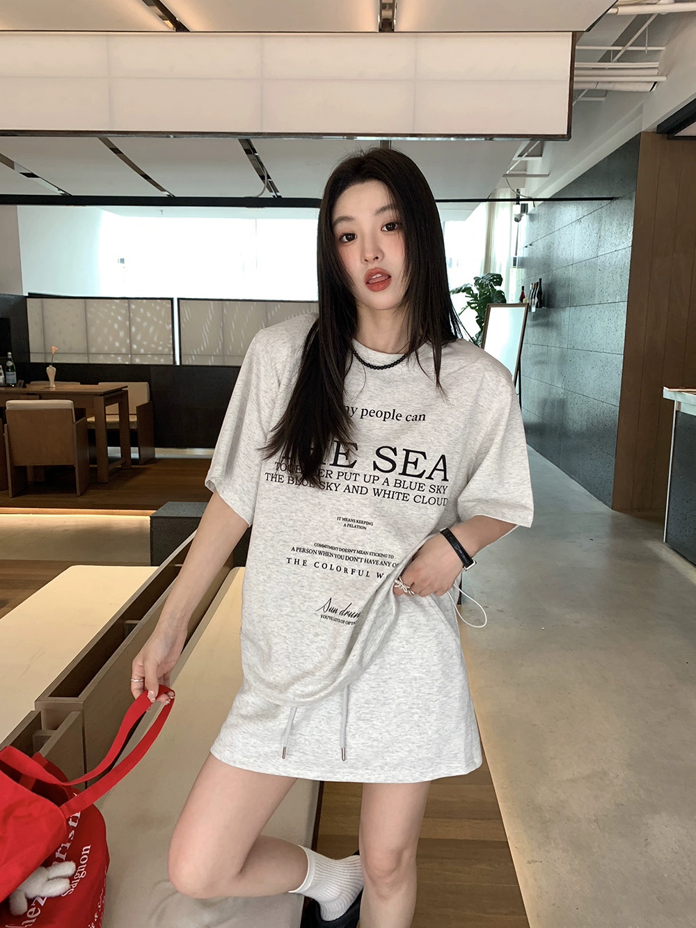 | nameOriginal | Letter printed side drawstring high waist slimming short sleeve T-shirt |